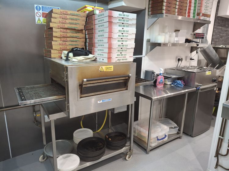 Prep Area 205 sq.ft. (19 sq.m) with sinks, pizza conveyor machine, chilled topping counter, fridges, washing machine.